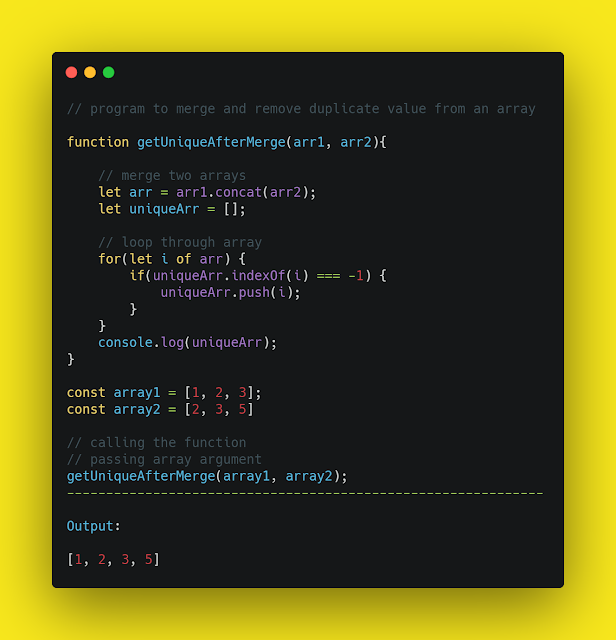 In the above program, two arrays are merged together and Set is used to remove duplicate items from an array.